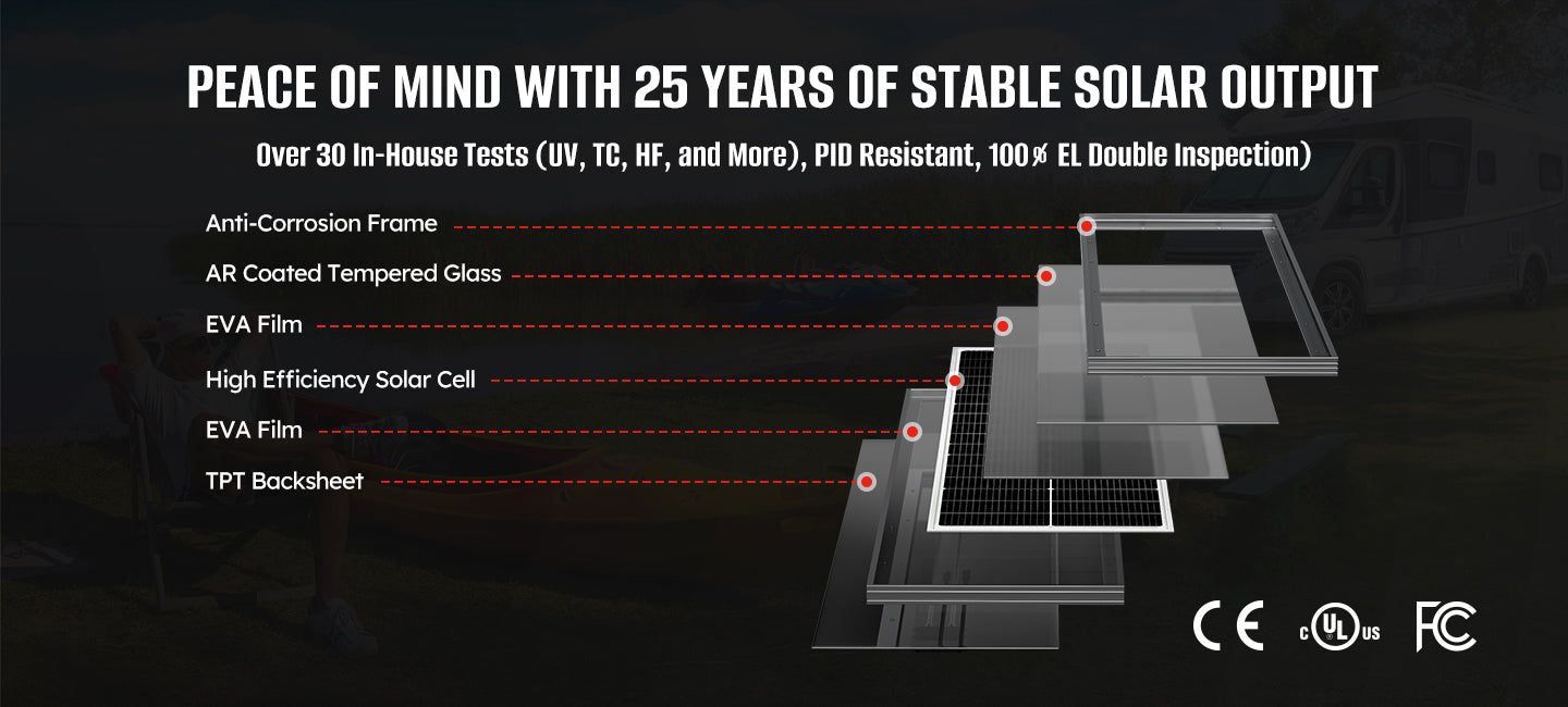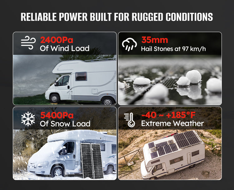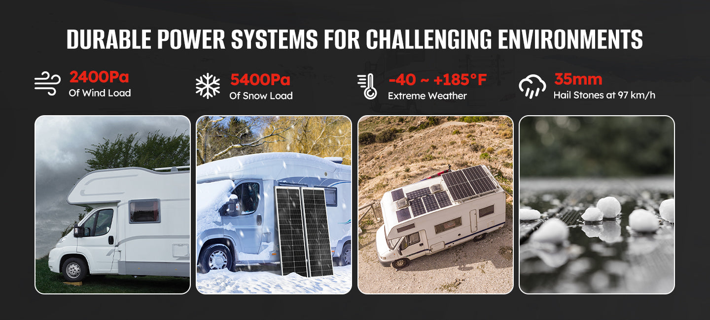 The solar panels are designed to permanently connect to your battery, so you don’t need to ever disconnect them when driving your RV or charging your battery from other sources.