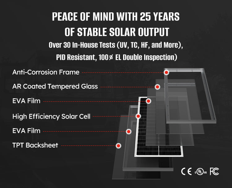 The solar panels have a performance warranty of 25 years. After 5 years of use, the panels should output more than 95% of the rated power. After 10 years, that output is 90%, and after 25 years, the output should be 80%.