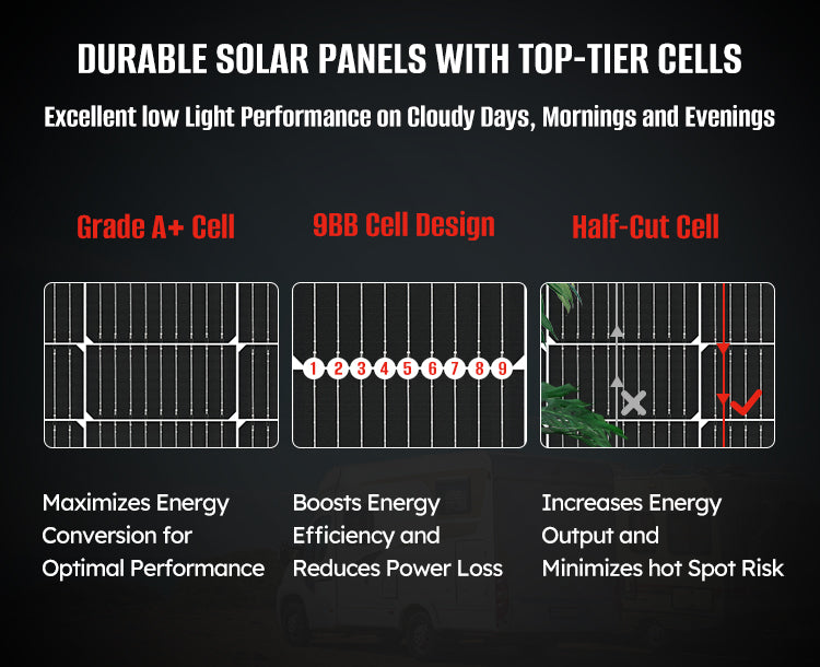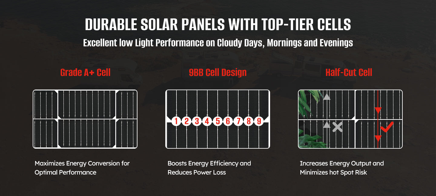 The solar panels are designed to permanently connect to your battery, so you don’t need to ever disconnect them when driving your RV or charging your battery from other sources.