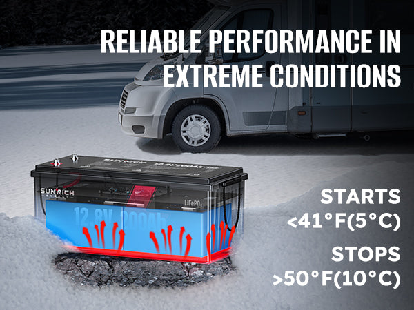 The self-heating function is activated by the BMS when the battery is connected to a charger at temperatures between -20℃ and 5℃ (-4℉ to 41℉). The heating stops once the battery reaches 10℃ (50℉).