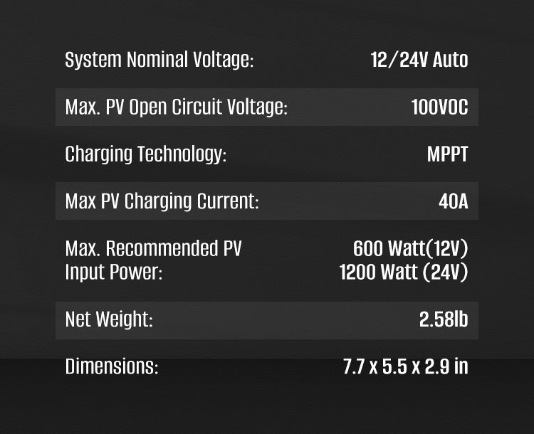 40A Charge Controller Specifications:
